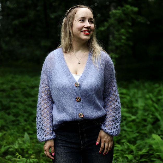 A fluffy cardigan with big, lace sleeves. The cardigan is worked top-down, flat. It features European shoulder construction and a deep V neck. The sleeves are worked in the round with a fun, holey lace pattern and finished with an i-cord bind-off. The double knitted button band is worked last.