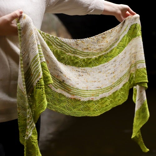 Limelight is a simple but beautiful crescent-shaped shawl with a fun and relaxing mix of garter stitch, short row stripes and simple lace. It is worked from the top down, starting with a garter-tab cast-on. Choose your favorite pop colour to bring a bit of brightness to this design! You can break the yarns between sections or just carry the other colour along by knitting the three edge stitches with both yarns.