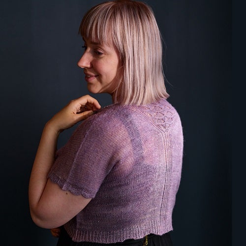 Orkidea is a joyful lightweight top for the summer that comes with an interesting construction. Orkidea starts off with provisional cast-on on the shoulders but there is no need for short row shaping as decreases at the back will pull them in place. The front doesn’t need any shaping. The V-neck will form on it’s own once the fronts are joined together. The sleeves have a fun cookie cutter edging and the pattern comes with instructions for an optional bust dart.