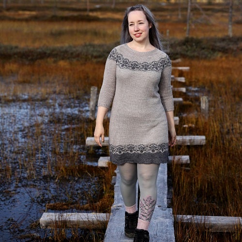 Calm is a relaxed dress worked seamlessly top-down. It has a round yoke with a sweet lotus flower pattern, 3/4 sleeves, waist shaping and a flowy hem mirroring the flowers of the yoke.