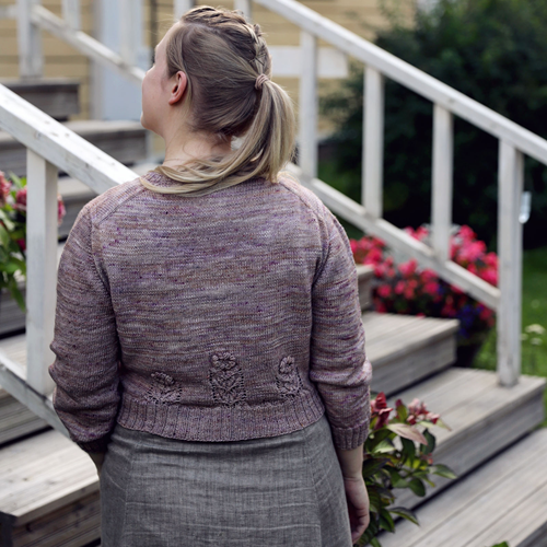 Mellow Meadow is a romantic little cardigan with a field of flowers on the back hem. The cardigan features a European shoulder construction and set-in sleeves with 3/4 length. The hem is cropped.