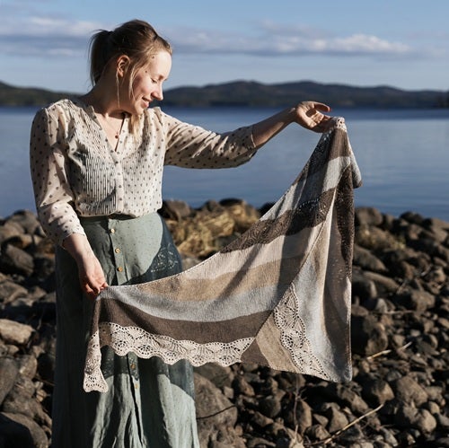 Tukuwool Cashmere Silk Lace (70% recycled cashmere, 30% silk, 175 m / 25 g), or other lace weight yarn. Shown in colours Middle Grey (C1), Light Beige (C2), Beige (C3) and Nut Brown (C4).