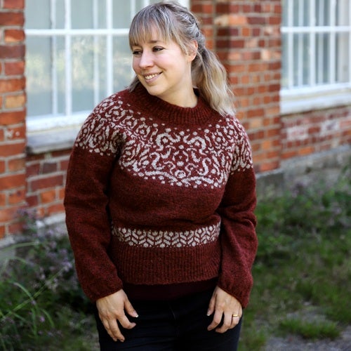 This sweater is worked top-down seamlessly. The sweater has a round yoke with a damask colorwork and a bit more colorwork on the hem. But the showstopper is the bigger pattern featured center front. The sweater has a folded mock turtleneck, long bishop sleeves, and a cropped hem with a slit. There are instructions for an optional bust dart.
