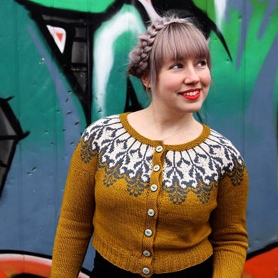 Budding is a joyous cardigan worked seamlessly top-down. The cardigan has a round yoke with a beautiful colorwork pattern. The cardigan has long sleeves and a cropped hem. Budding has positive ease yet a close-fitting hem ribbing at the natural waist making it comfortable and stylish at the same time. The cardigan is worked in the round and cut open at once finished. The pattern can easily be modified into a sweater by omitting the steek.