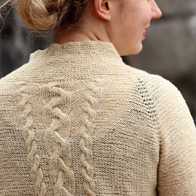 Flying donegal is a relaxed and stylish cardigan with cables in the back. The cardigan features raglan sleeves and a wide shawl collar in garter stitch.