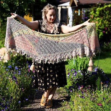 A romantic shawl worked in three colors, seven different lace patterns and finished with a picot bind off.